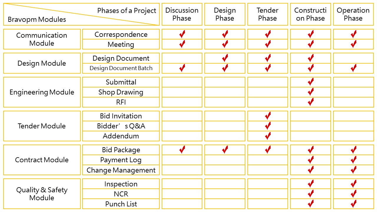 There are at least five phases throughout the whole life-cycle of a typical construction project: discussion, design, tender, build, and operation. Different stages focus on different purposes, with different participants, and with diverse responsibilities. Every phase is connected closely and inseparable, which challenges the ability of construction project management. In the past, managing the projects merely through brains and papers is laborious and painstaking. Now, we furnish Bravopm as a solution and aim to help you streamline your projects.