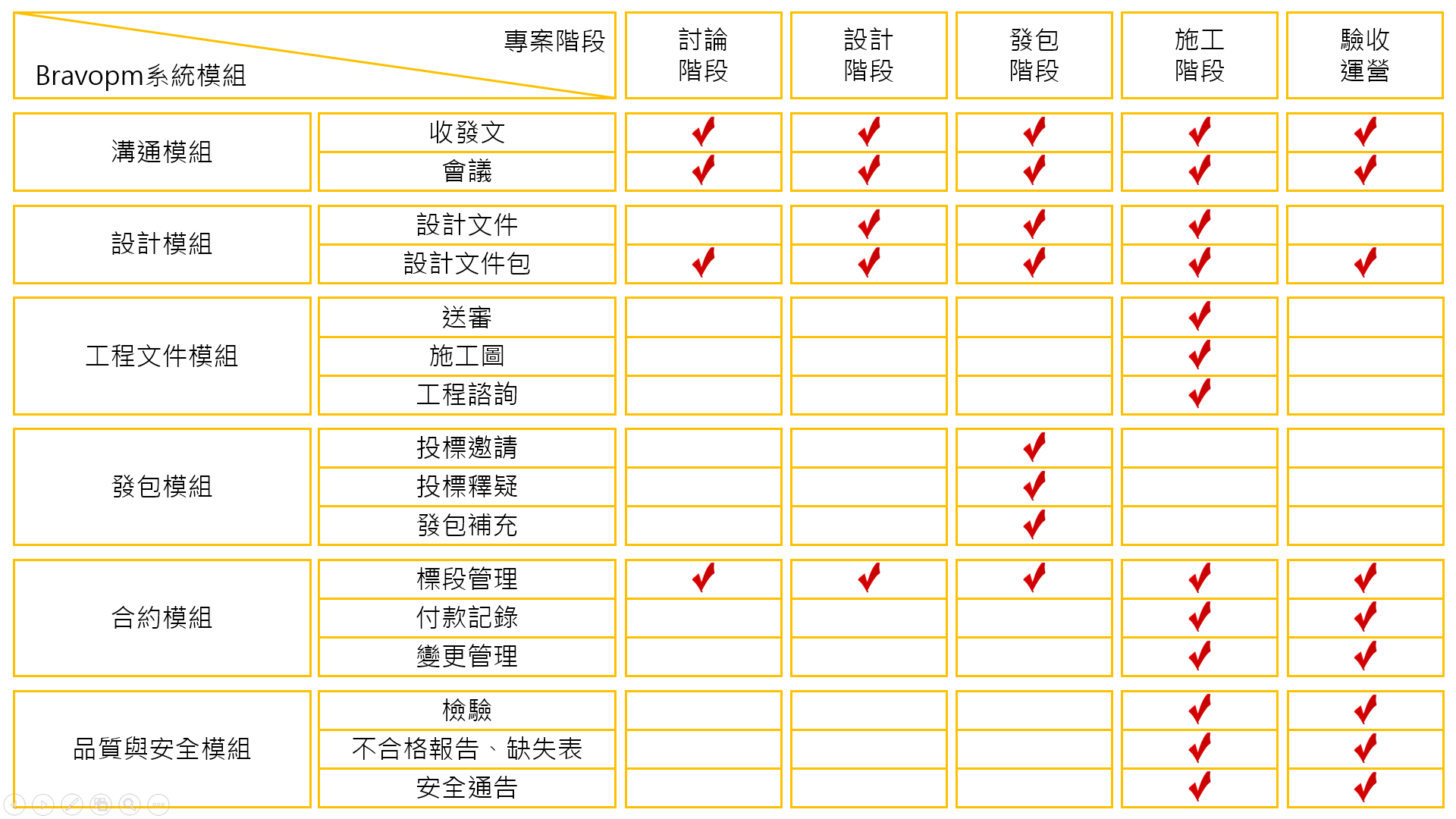 討論階段 在各方仍在評估、規劃、討論時,您會需要用到溝通模組中的收發文、會議記錄等功能,來協助您更有效率地管理這些來來往往的文件。您也會需要設計模組中的設計文件包和合約模組中的標段管理等功能,讓專案人員能在一個平台討論。 設計階段 在設計階段,您會需要使用到溝通模組中的收發文、會議記錄,設計模組中的設計文件、設計文件包,以及合約模組中的標段管理等功能。 發包階段 在發包階段,您會需要使用到溝通模組中的收發文、會議記錄,設計模組中的設計文件、設計文件包,發包模組的投標邀請、投標釋疑、發包補充,以及合約模組中的標段管理等功能。 施工階段 在施工階段,您要處理的事情更加繁雜了。您會使用到溝通模組中的收發文、會議記錄,設計模組中的設計文件、設計文件包。還有工程模組,舉凡送審、施工圖、工程諮詢(RFI)等,合約模組中的標段管理、付款紀錄、變更管理等,以及品質安全模組中的檢驗、NCR、缺失表等,Bravopm也都替您一手包辦。 驗收營運階段 在最後的階段,您會需要使用到溝通模組中的收發文、會議記錄,設計模組中的設計文件包,合約模組中的標段管理、付款紀錄、變更管理等,以及品質安全模組中的檢驗、NCR、缺失表等。讓您能夠替專案畫下完美的句點。 |