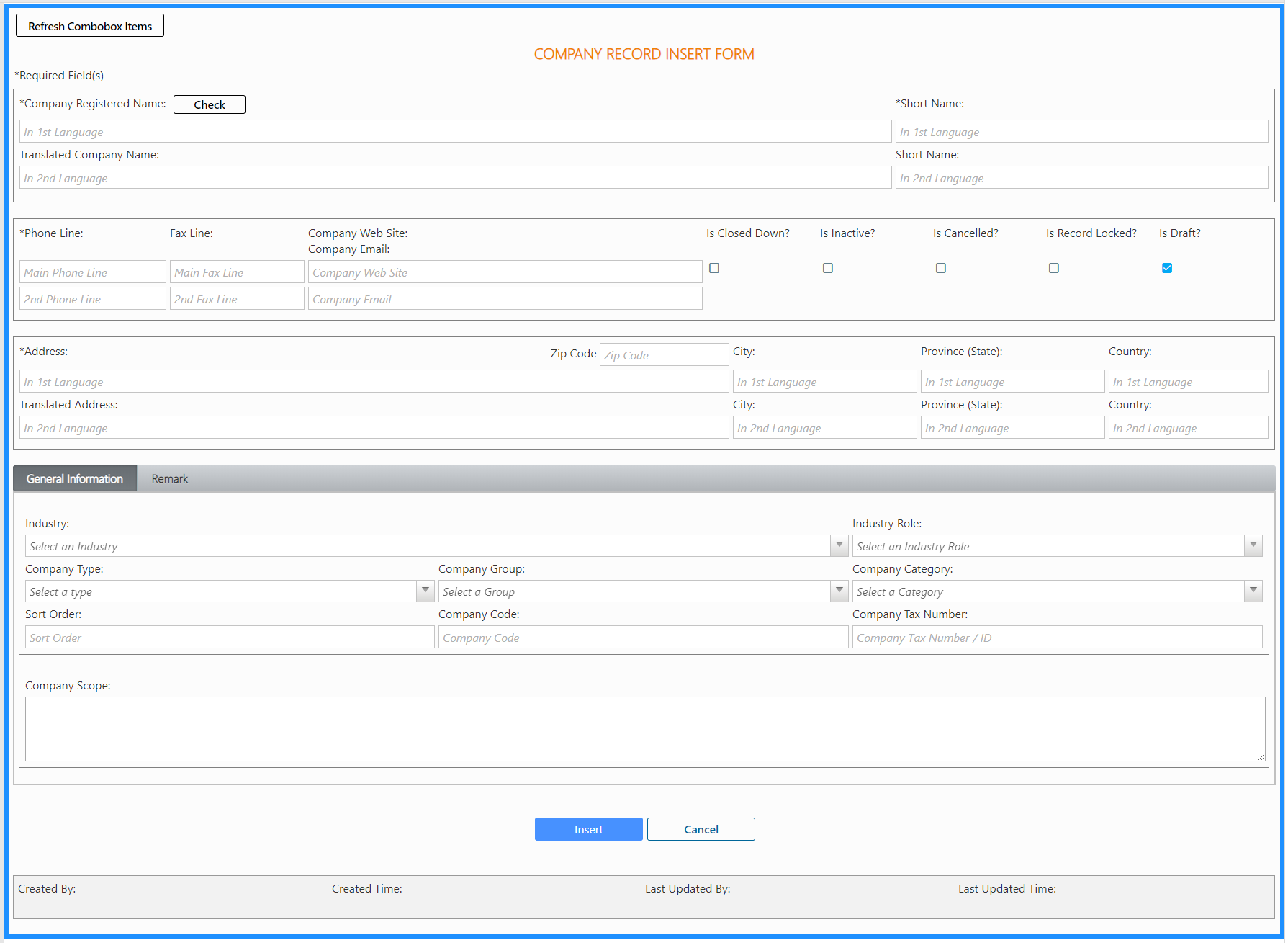 Once you finish inputting the fields, you can scroll downward to the bottom of the page and find the [Insert] button to create this record. After you successfully create it, the system will automatically open the just-created record of company to let you review or edit.