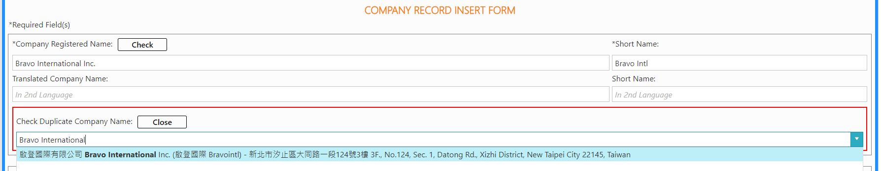 Important: When you add or edit a company record, Bravopm will check if there already exists a company record with the same name. However, there are cases that a company has diverse names so that the system cannot tell whether they are the same company one or not. Bravopm provides [Check] function to filter quickly the existing records with similar keywords in company name.