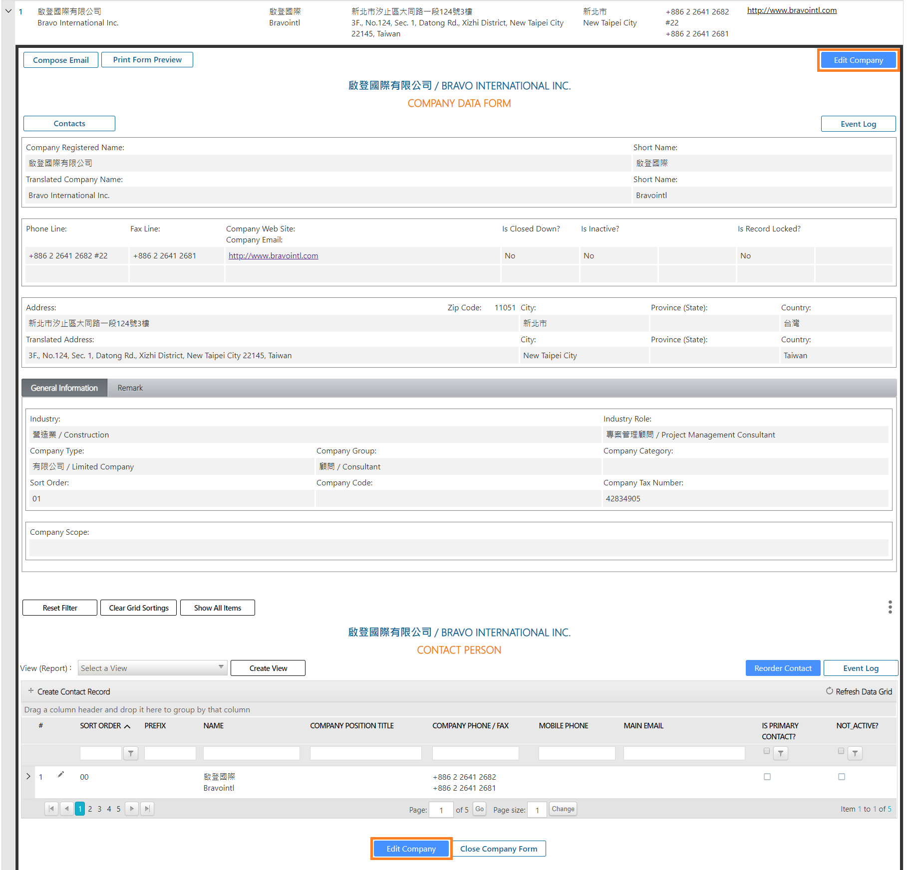 Expand the [Company Data Form]. Users with permission to edit can see the [Edit Company] button on the upper right corner of the grid. Click [Edit Company] to access the company record in edit mode. Then, modify the profile information as needed.