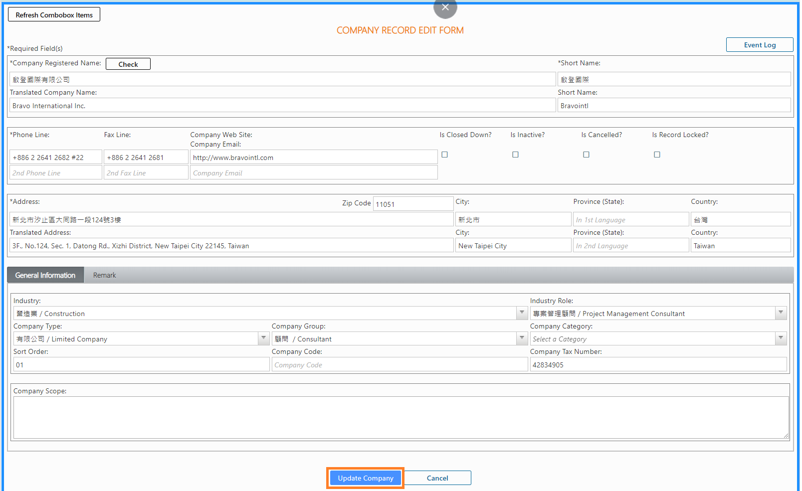 [Is Cancelled?]:If you place a checkmark here, it means this record of company is no longer valid, and you should not use it anymore. The display of the cancelled company will be in light grey and will have a strikethrough on it.