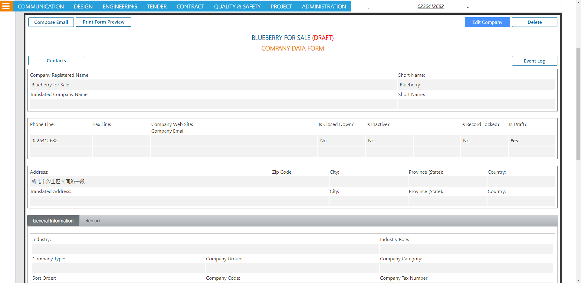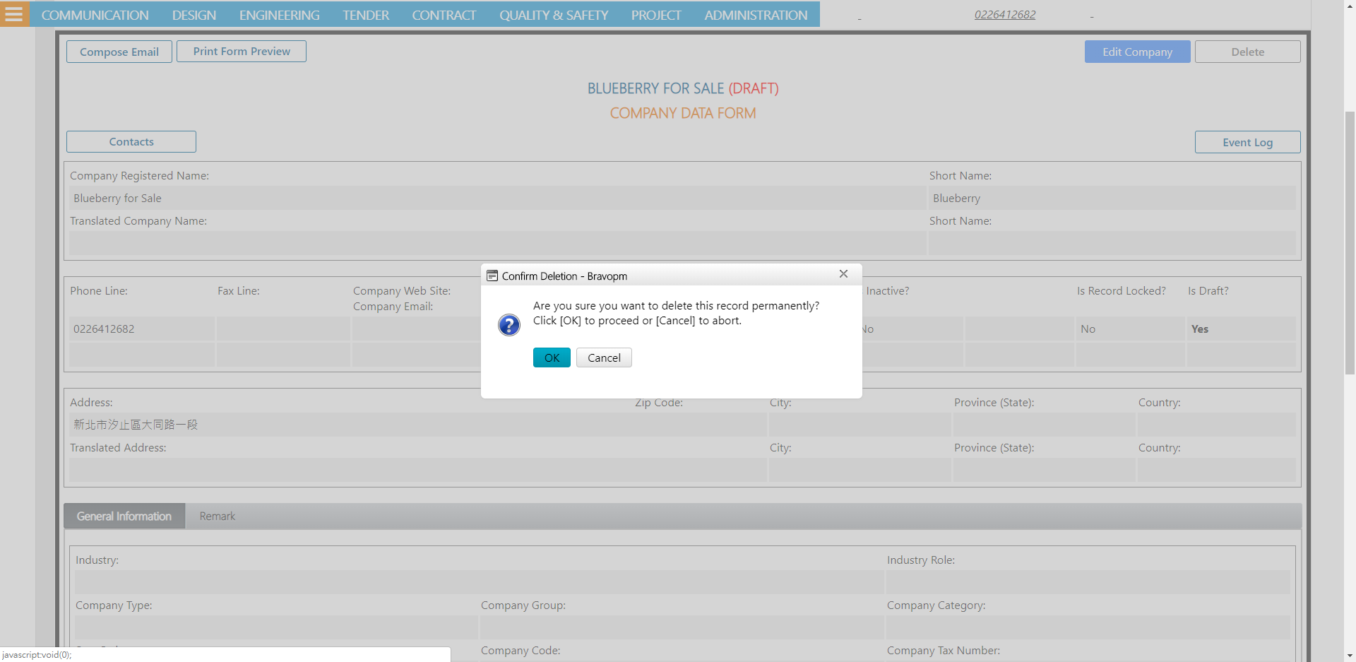 [Is Draft?]:When you add a new record of company, this checkbox is marked by default to keep it in the draft status so that you can still delete it after you create this record. Once you unmark this checkbox, the system will ask you if you are sure to turn this record into the official record, which cannot be deleted afterward.