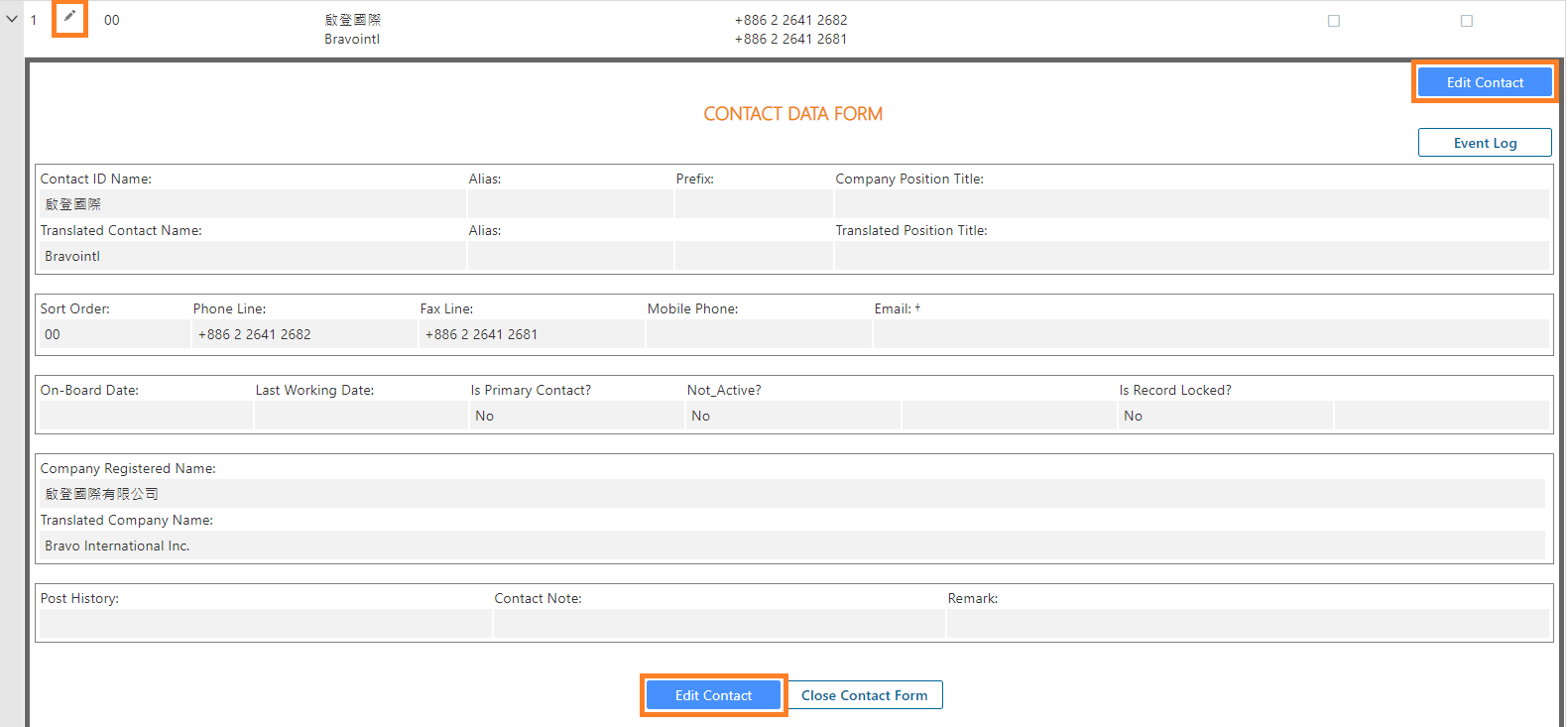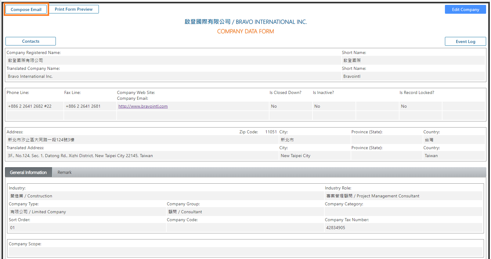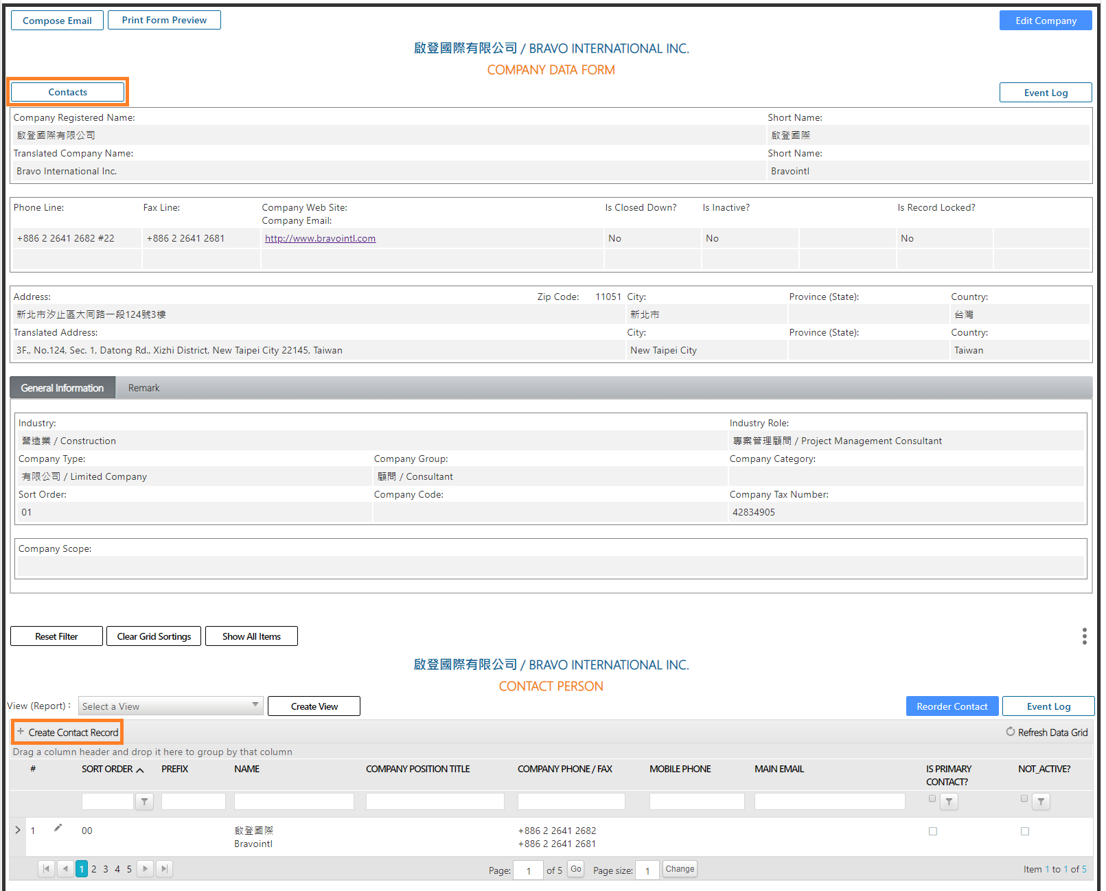 - When the company record is no longer in draft status and is officially created, Bravopm will automatically produce a contact record named after the short name of the company. That contact record will be numbered as 00, along with company phone line, fax line, and email, etc.