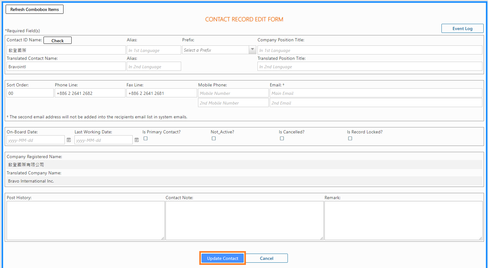 [Company Position Title]/ [Translated Position Title]:Input the position title of the contact. Bravopm offers 1st language and 2nd language fields. You can input both or either.