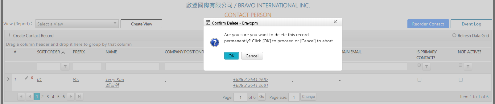 Bravopm will ask you to confirm the action. Click [OK], the record will be deleted immediately. Click [Cancel], the action of deletion will be cancelled.