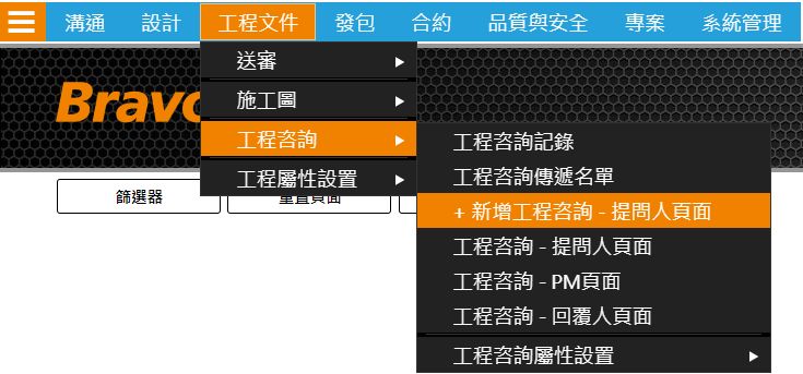 如圖所示,展開[工程文件]功能表,點選[+新增工程諮詢 – 提問人頁面]。