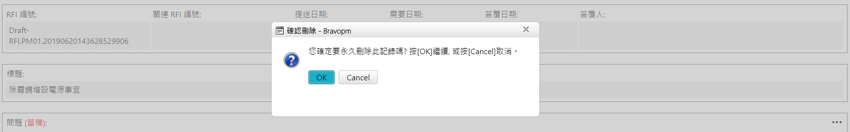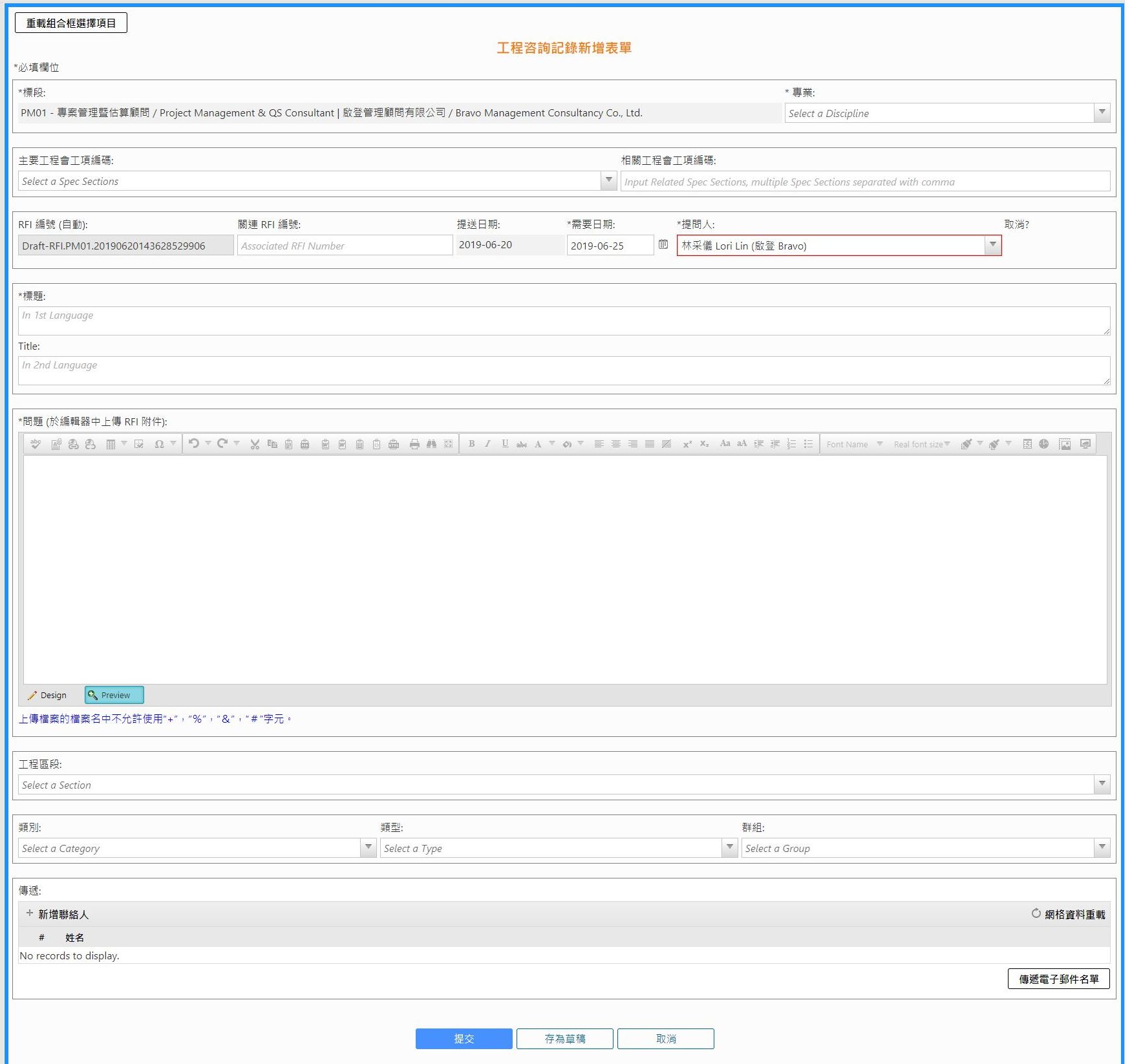 提示:記錄尚未按下[提送]按鈕時,系統會生成草稿RFI編號。當用戶按下[建立]時,便會轉為正式RFI編號。