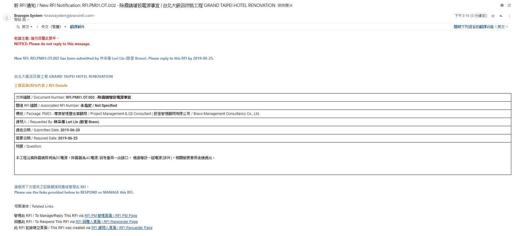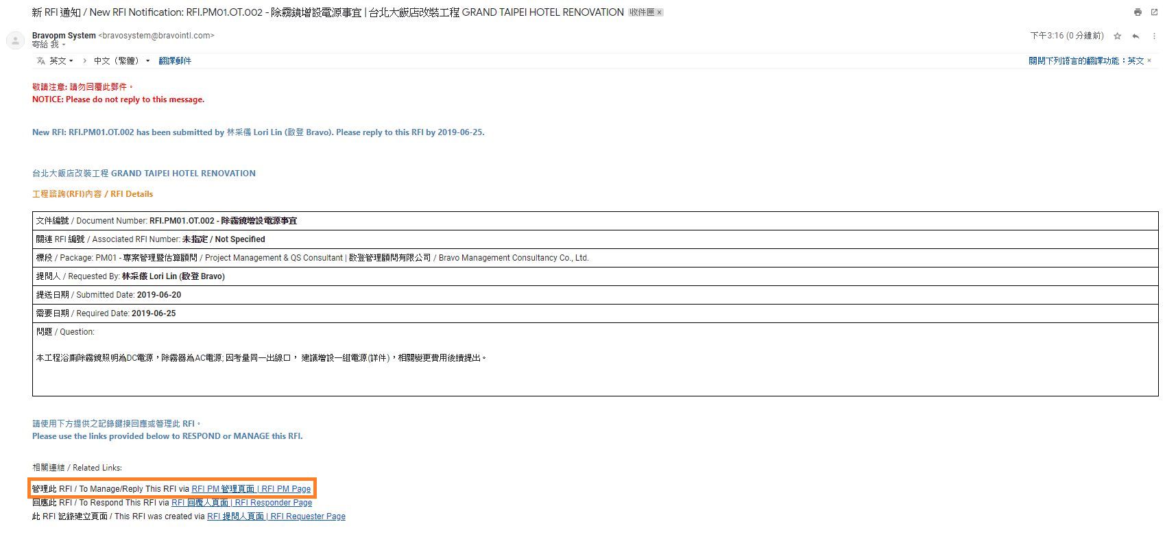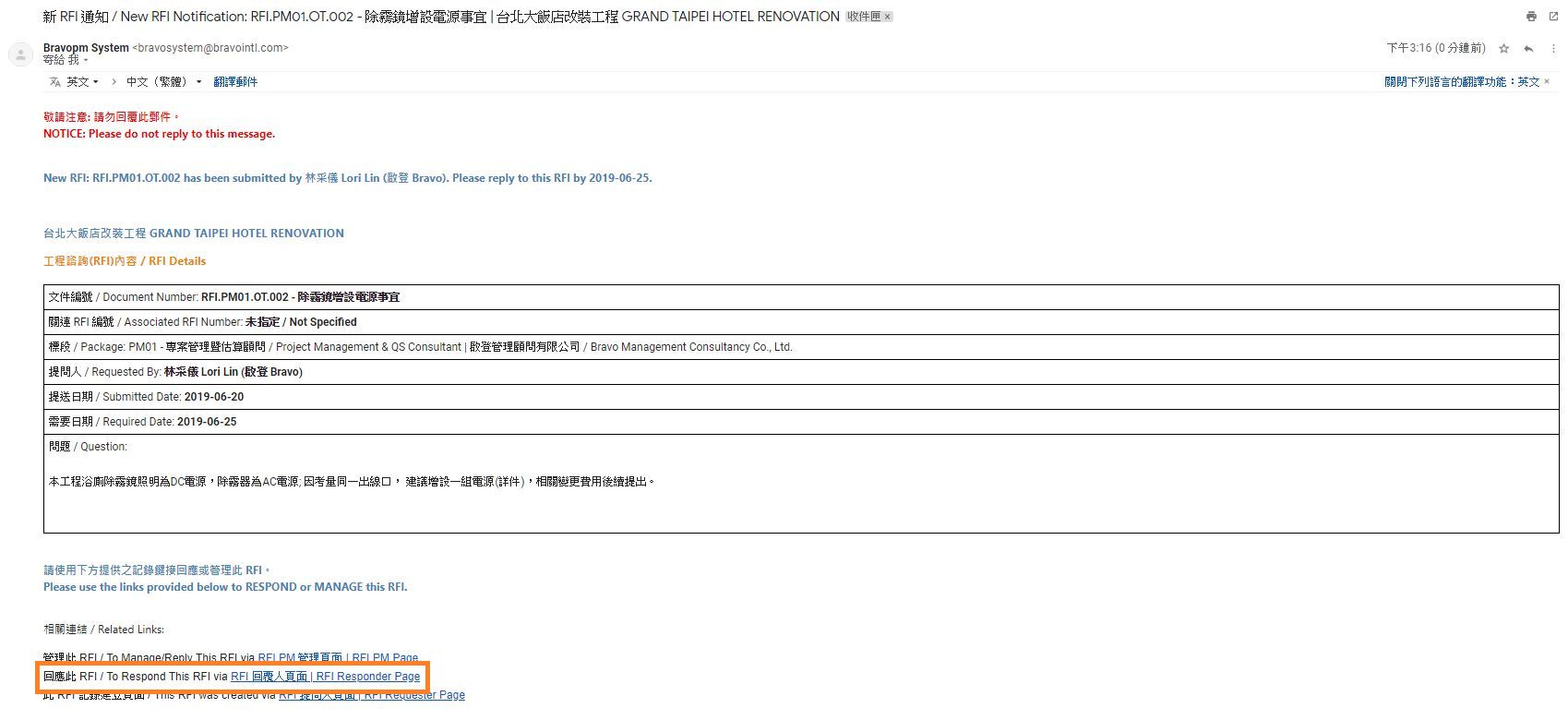 按下自動通知郵件底部的[RFI 回覆人頁面],登入系統後直接進入此筆記錄。