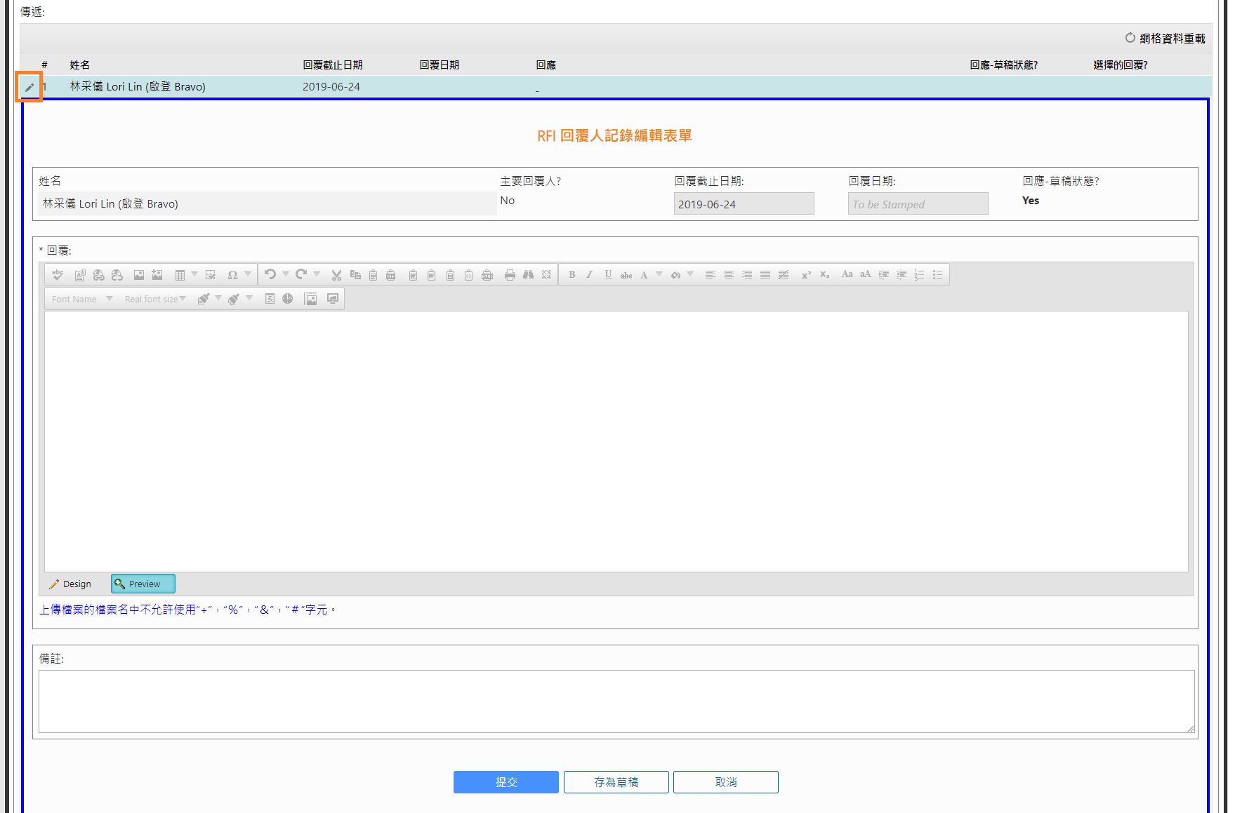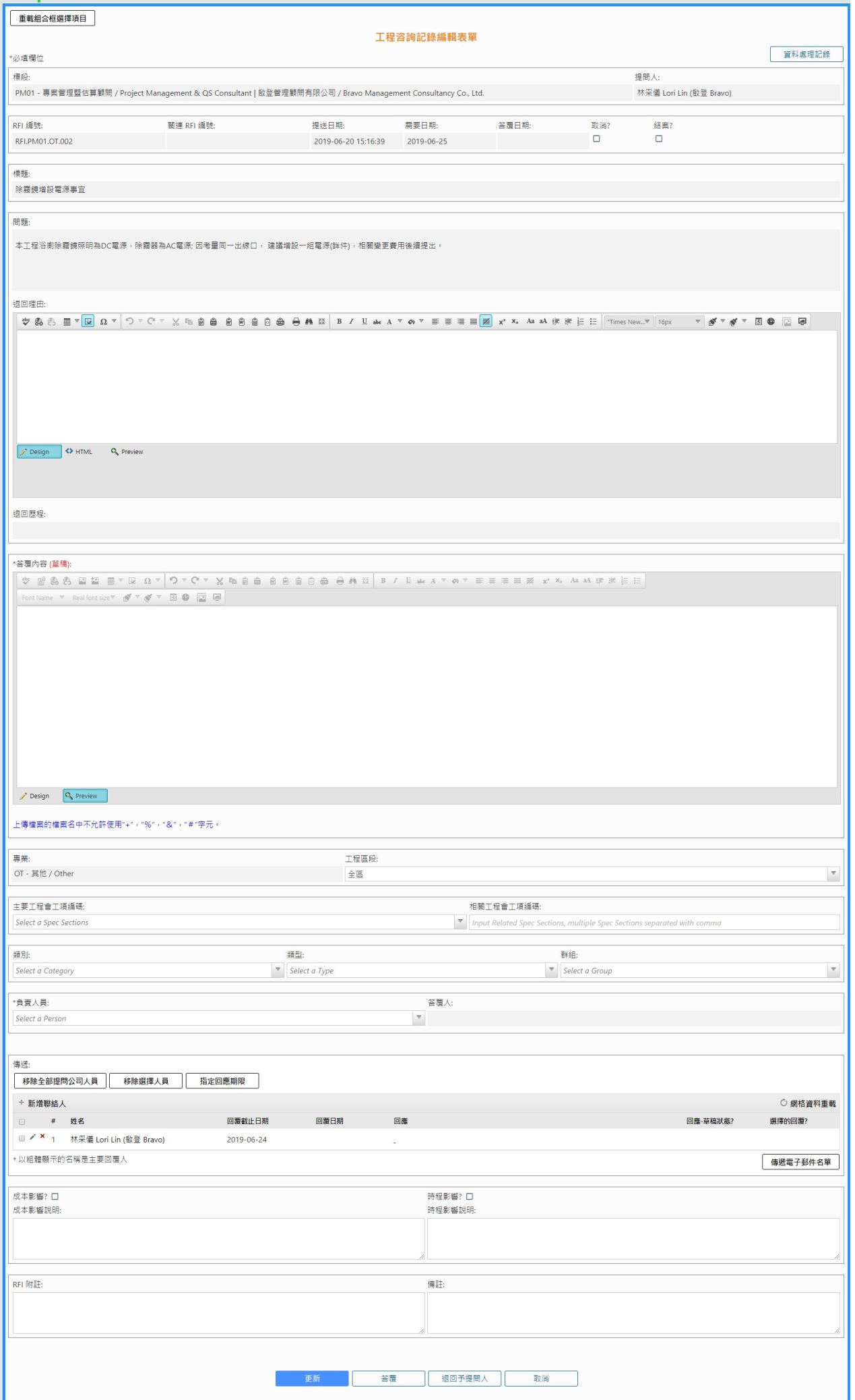 - 工程諮詢記錄於回覆人頁面時只有在草稿狀態或回覆被PM人員退回時才可進行編輯,如需修改已提交的回覆,請聯繫負責人員進行退回。