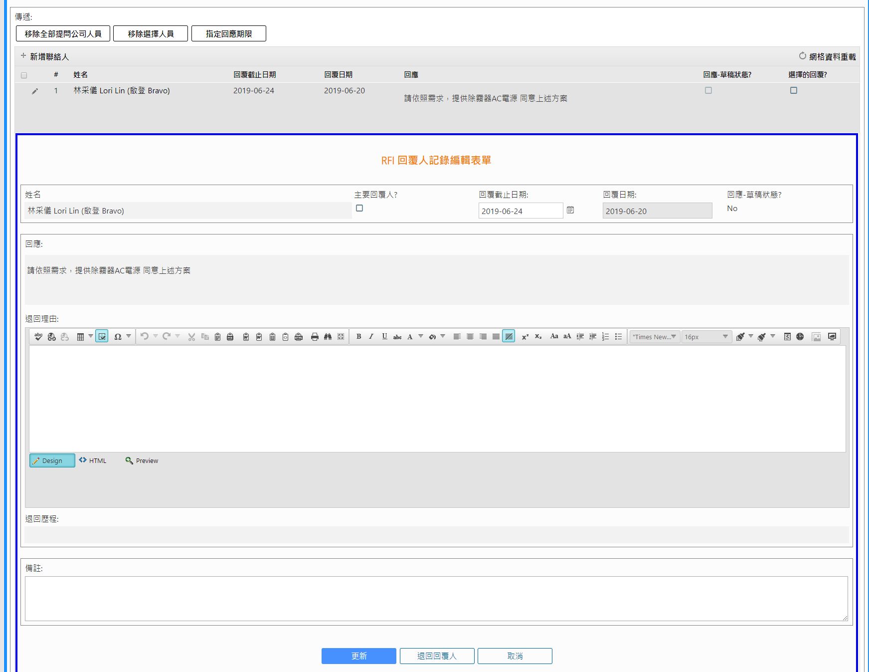 [退回理由]:回覆人意見有誤或申請修正時,PM人員可將該回覆退回給回覆人,並於此欄位填寫退回原因。填寫完畢後按下表單下方[退回回覆人]按鈕,系統將發送自動通知信件給回覆人通知重新編輯回覆。