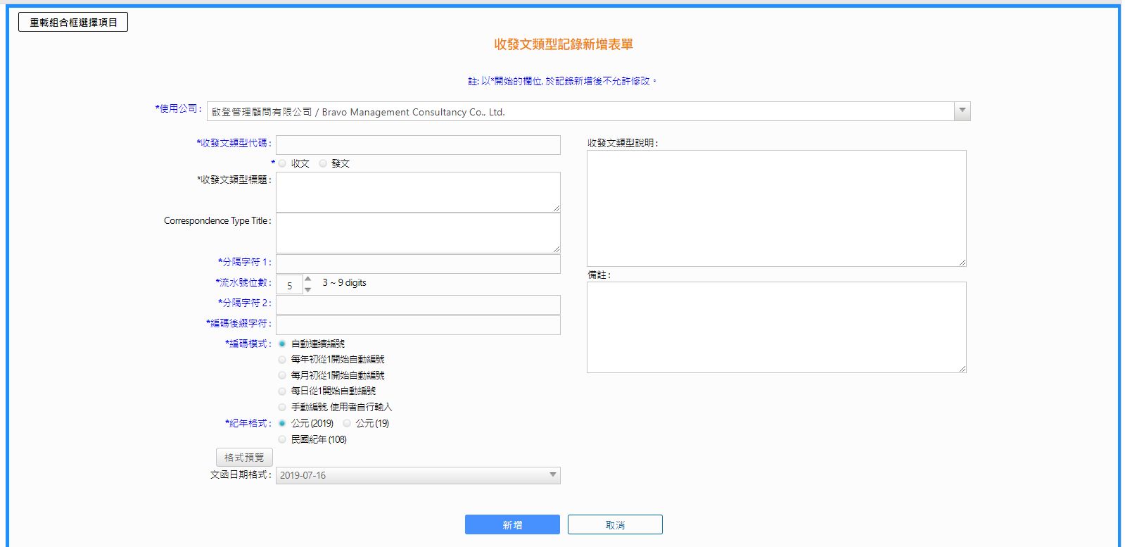 提示:只有所屬此間使用公司中的人員可以新增或編輯該收發文類型,非此公司的人員則無法使用該收發文類型。