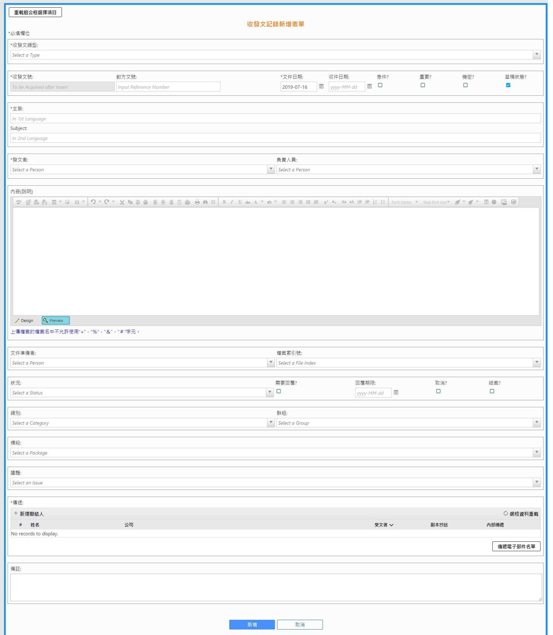 表單資料填寫完畢後,按下表單最下方[新增]按鈕建立記錄。成功建立記錄後,系統會自動打開剛才新增的收發文表單,讓用戶檢視或修改。