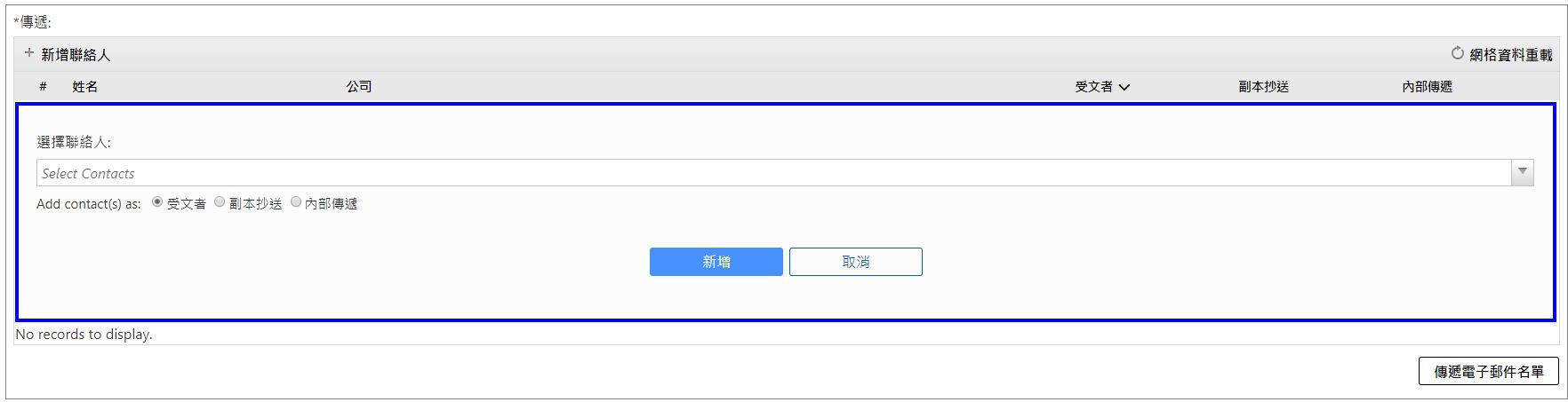 - 在收件人頁面中,需用戶自己或同公司人員位在傳遞名單上,才可看見該筆記錄。若該記錄被勾選[機密]核取框,則只有位在傳遞欄位中的人員才可瀏覽此筆記錄。