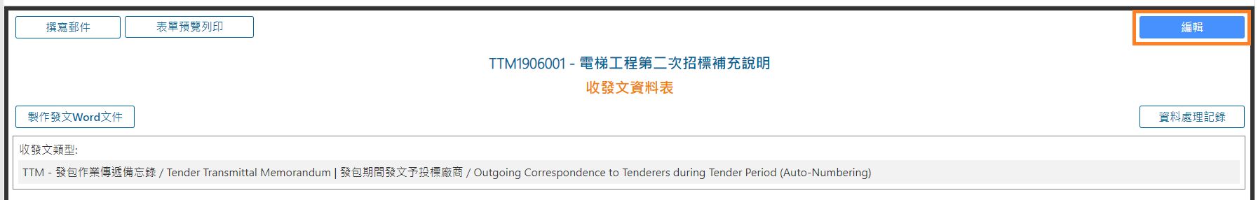 打開收發文資料表,具有編輯權限用戶可看到[編輯]按鈕,按下後可打開收發文記錄編輯表單。
