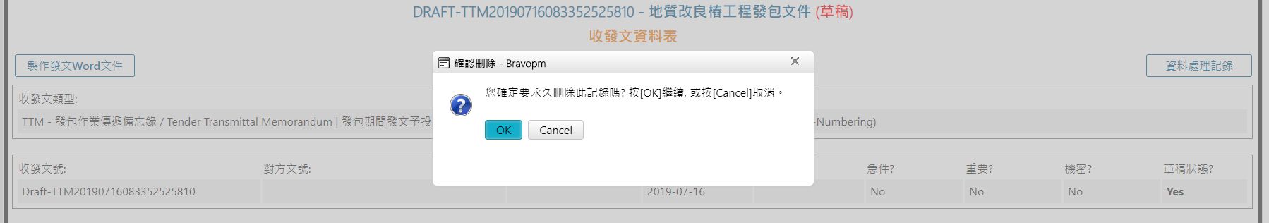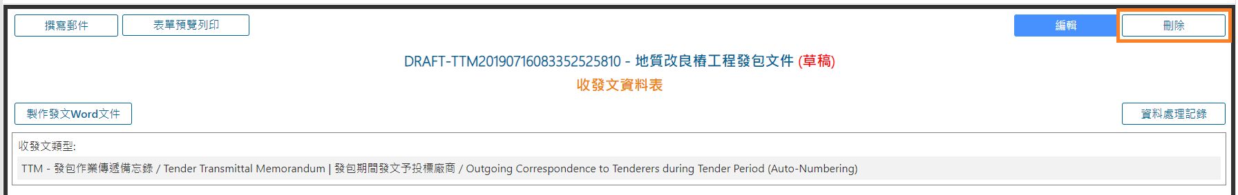 - 當收發文記錄為草稿狀態時才可由記錄建立者或管理員刪除。