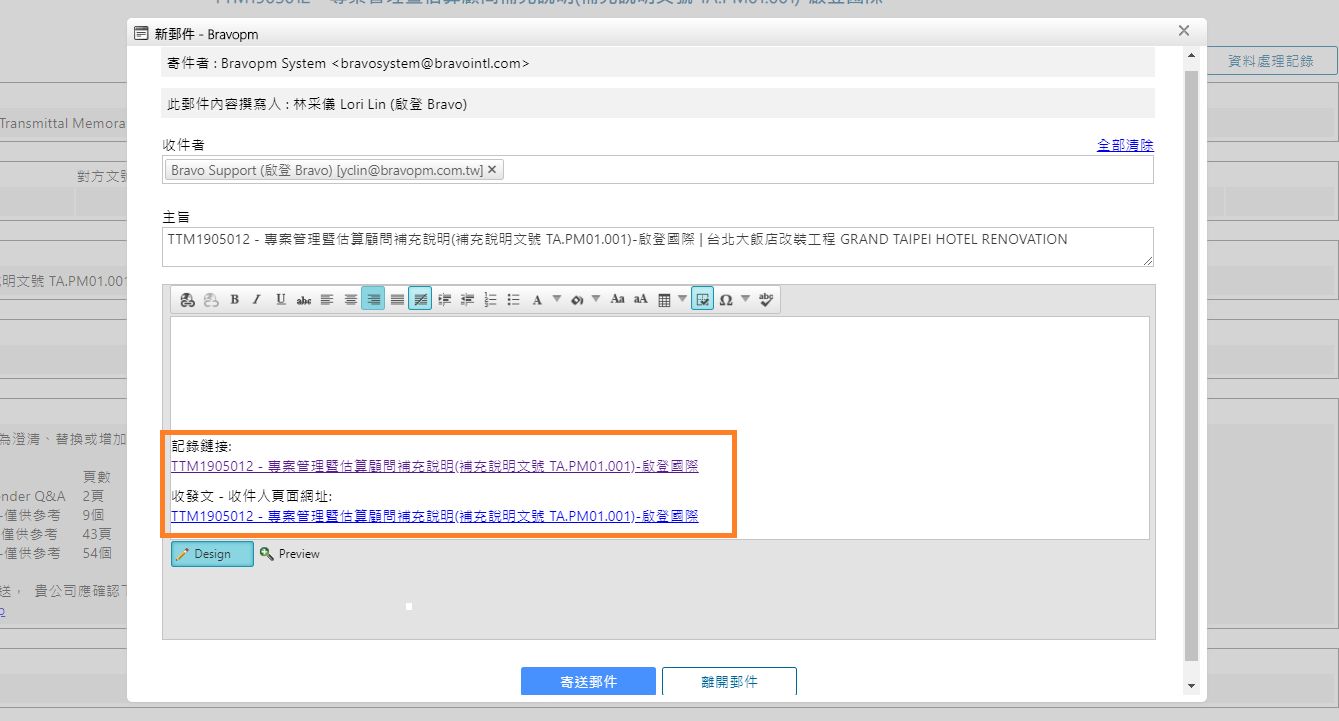 - 使用[撰寫郵件]功能時,系統會自動帶入該筆記錄在[收發文]及[收發文記錄-收件人頁面]的連結,使用者可依寄送對象的權限選擇應保留的連結。