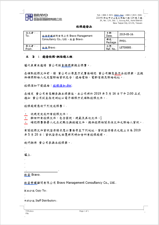 [上傳Word範本]:使用者可提供公司現有收發文類型的Word範本格式,並填寫欲放入的欄位資訊,以供Bravo Support小組協助製作此類型的Word範本並上傳。
